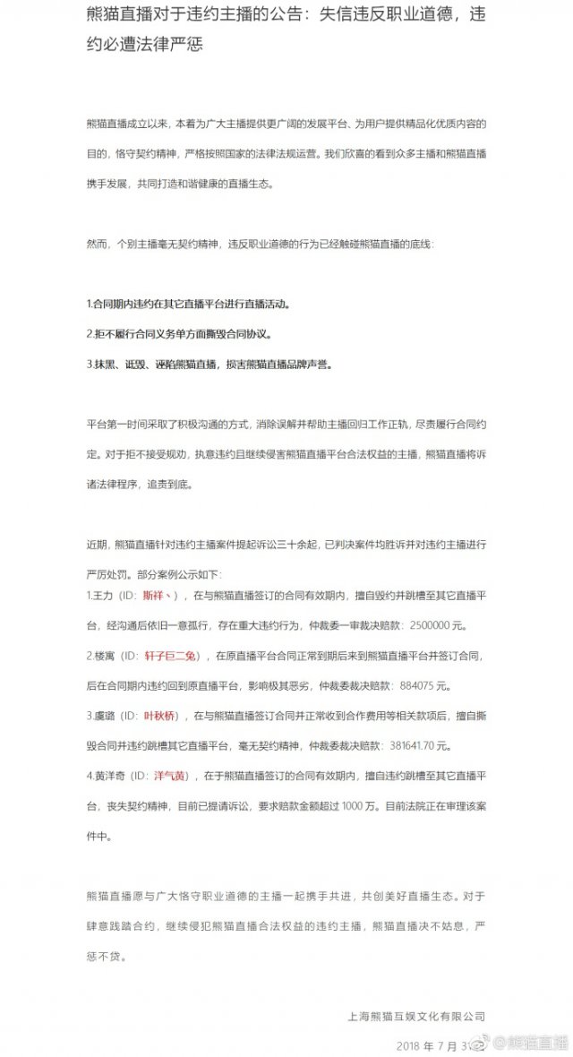熊猫直播表示,个别主播毫无契约精神,违反职业道德的行为已经触碰熊猫直播的底线,包括合同期内违约在其它直播平台进行直播活动、拒不履行合同义务单方面撕毁合同协议、抹黑、诋毁、诬陷熊猫直播,损害熊猫直播品牌声誉等等。