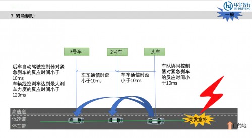 当前车发现前方有突发意外情况,需要紧急制动的同时,会将紧急刹车指令下发给后车,而不需要后车发现前车减速后才做出刹车响应,因此前后车的紧急制动响应时差仅仅在于网络传输时延(<10ms),做到更好地同步,避免追尾事故。