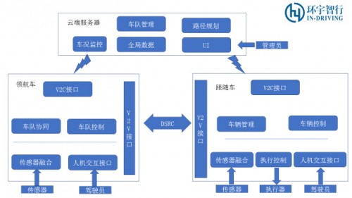 领航车和跟随车都能够通过4G/5G网络与云端服务器连接,实现交互。车辆将自身信息上报给云端服务器,服务器实现车况监控、调度、管理的作用。
