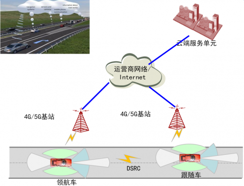 关于编队自动驾驶是车与车之间通过DSRC进行通信,其中领航车包含车队控制单元(PCU),负责协调车队内各车辆,使其保证一定的安全距离,进行编队行驶。
