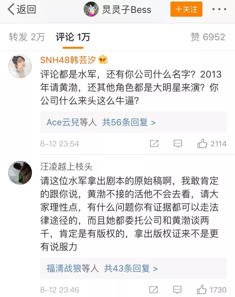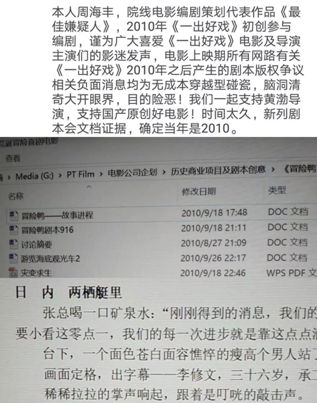目前,《一出好戏》官博和黄渤均未出面回应,但参与剧本初创的编剧周海丰却在微博和知乎相继发言。在知乎上,周海丰的认证为丰宜影业董事长,他称自己在2010年便参与了《一出好戏》的初创,并晒出了剧本截图和剧本会议时间。