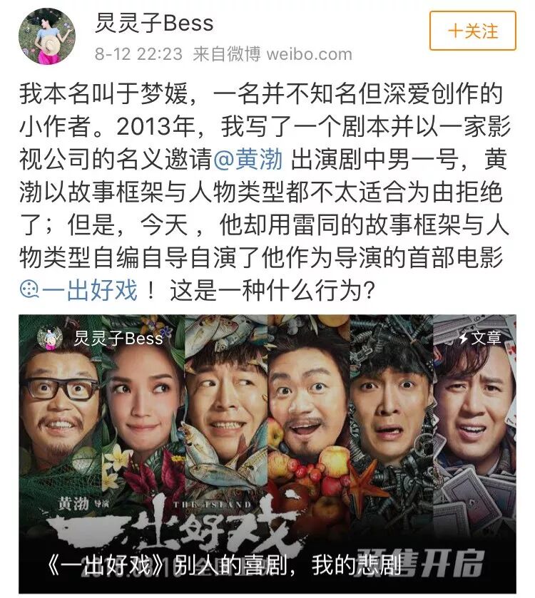 7月12日晚间,编剧于梦媛在微博实名举报黄渤执导电影《一出好戏》剧本抄袭自己的作品《男人危机》,在长文中,于梦媛列举了不少《男人危机》和《一出好戏》的剧本相似之处。对此,《一出好戏》片方和黄渤均未回应,但编剧周海丰在社交网络表示于梦媛只是碰瓷。