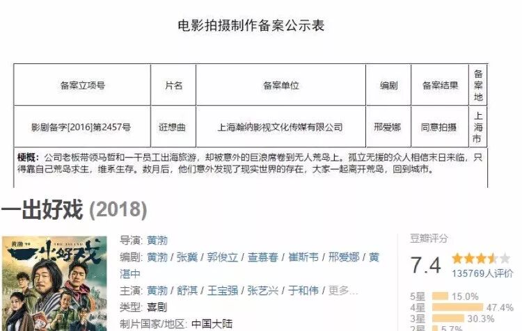 从广电总局的电影拍摄制作备案公示来看,《一出好戏》最初的编剧栏显示的是邢爱娜,即知名导演宁浩的妻子。不过从豆瓣的编剧栏可以看出,《一出好戏》的编剧共有黄渤 / 张冀 / 郭俊立 / 查慕春 / 崔斯韦 / 邢爱娜 / 黄湛中7人。在人数较多的作品中,署名权先后顺序虽然是由作者协商决定,不过一旦剧本出现问题,多名编剧都将受到波及