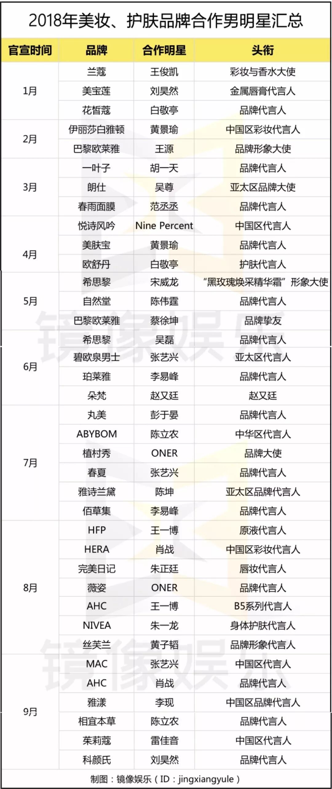 根据镜像娱乐(ID:jingxiangyule)不完全统计,2018年以来,共有40个左右的品牌签订了男明星为品牌代言人/品牌大使,其中不乏陈坤、吴尊、赵又廷、彭于晏等老牌明星,但更多是市场上的人气/流量新星,如王俊凯、刘昊然、Nine Percent、ONER等。而在2015年左右的时候,国内还鲜少有用男明星做代言的品牌。