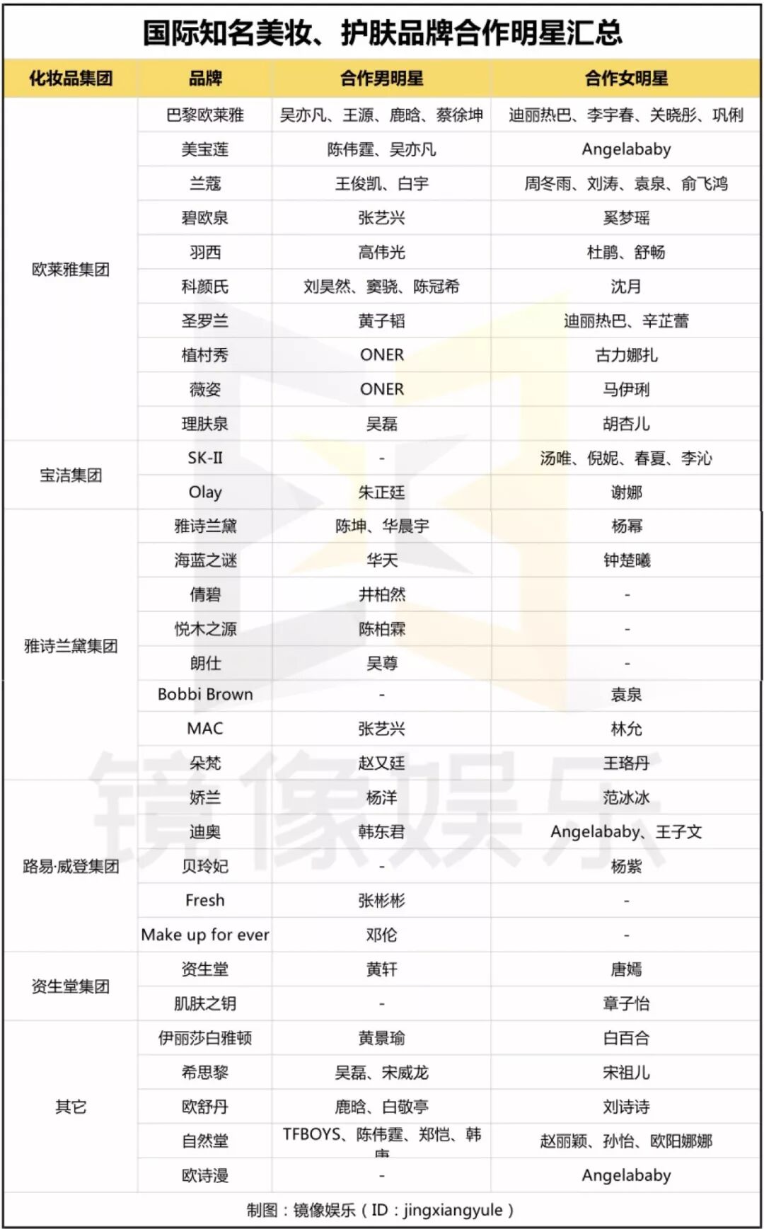 但从头衔的不同,也可看出男女明星在美妆、护肤品牌眼中的受宠程度不同。镜像娱乐(ID:jingxiangyule)发现,刘昊然为科颜氏品牌代言人,而沈月仅为品牌青春大使;黄子韬作为YSL美妆音乐大使,推广了YSL多款产品,而迪丽热巴仅为香水大使;MAC的品牌代言人为张艺兴,而林允仅为品牌大使;同样,杨洋为娇兰的品牌代言人,而在范冰冰未“消失”前,也仅拿下了彩妆及香水代言人头衔。