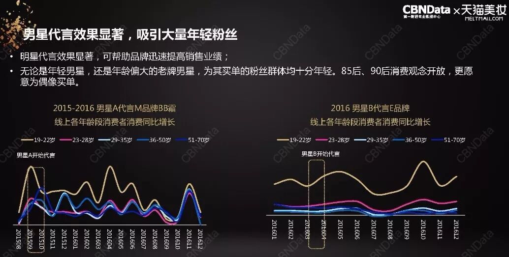 天猫数据显示,2017年8月-2018年7月,淘宝上男性用户购买的BB霜合计达到了155万瓶。2015年-2017年,男性购买彩妆的销售额和人数趋势呈连年增长趋势,2018年男性美妆消费人数同比增速甚至超过了女性。也就是说,男明星代言美妆、护肤品牌,不仅能吸引女性粉丝群体达成购买,对正在不断增长的男性美妆消费群体也是一大吸引力。