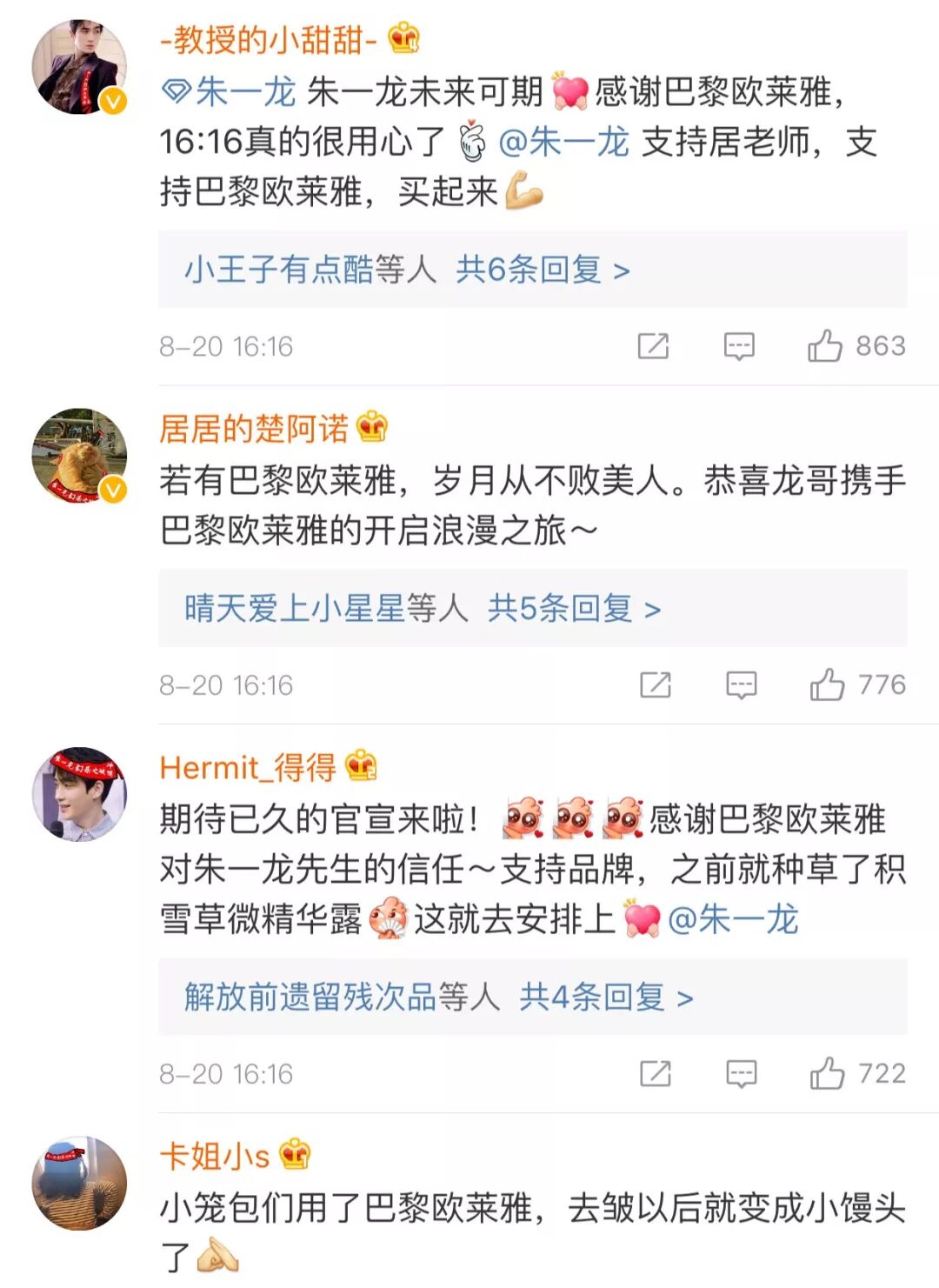 日前,向来最喜欢合作“当红炸子鸡”的巴黎欧莱雅宣布朱一龙成为旗下产品积雪草微精华露的品牌体验官,官宣后微博评论人数上万,朱一龙粉丝们大赞金主爸爸的同时,也纷纷表诚心,表示自己已经排着队,拿着花钱的号码牌了。一位《镇魂》之后粉上朱一龙的粉丝告诉小编:“龙哥走红不易,《镇魂》之后,代言才慢慢多起来了,不管是KFC、农夫山泉、味全酸奶、联想手机等,粉丝都在尽力提高销量,毕竟金主觉得他有市场才会捧他。”