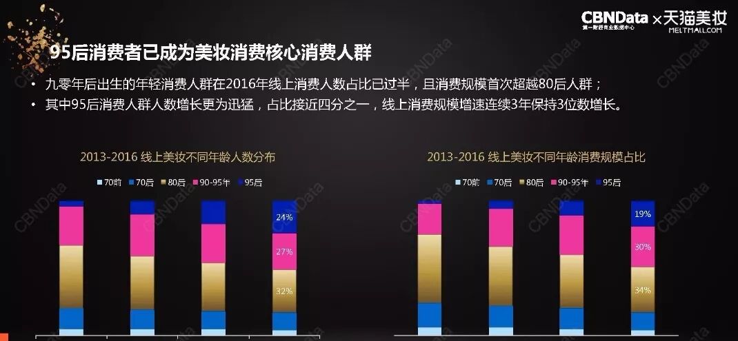 年轻一代的消费者正在迅速崛起,这是整个市场的大趋势。CBNData《2017中国美妆个护消费趋势报告》也显示,95后消费者已经成为美妆品牌核心消费人群。2013年-2016年,95后美妆消费人群人数增长迅猛,占比接近四分之一,线上消费规模增速连续3年保持了3位数的增长,且在2016年消费规模首次超过80后人群。