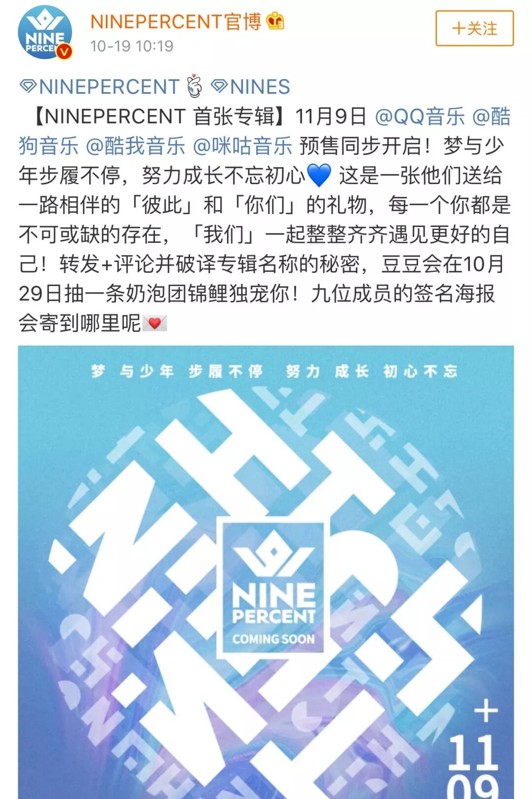 相比之下,Nine Percent因为成员难合体、合约复杂等原因,导致《偶像练习生》出道夜承诺的5月中旬上线的团综《百分百少年》仍未播出,目前排播时间安排在了Q4,旅行节目《青春的花路》也是近日才上线。与此同时,Nine Percent出道至今仍未发布团体专辑,今日Nine Percent官博才官宣第一张团体专辑将于11月9日上线。不过,蔡徐坤出道至今倒是已经发布了两张个人专辑。