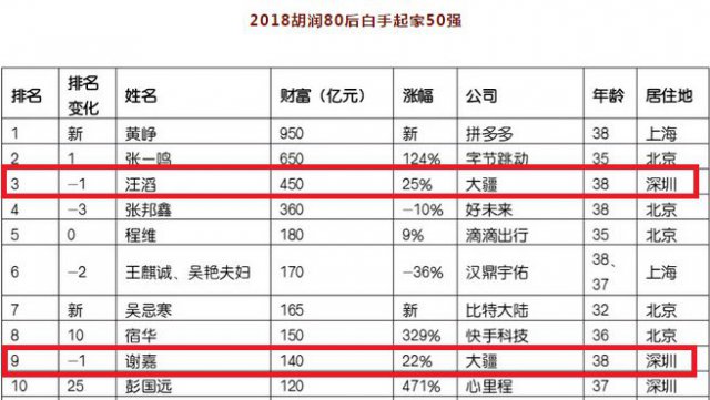低调的 " 无人机大王 "、大疆的汪滔以 450 亿元个人财富,位列胡润 80 后白手起家富豪榜第三名,在胡润百富榜中居前 50 名。