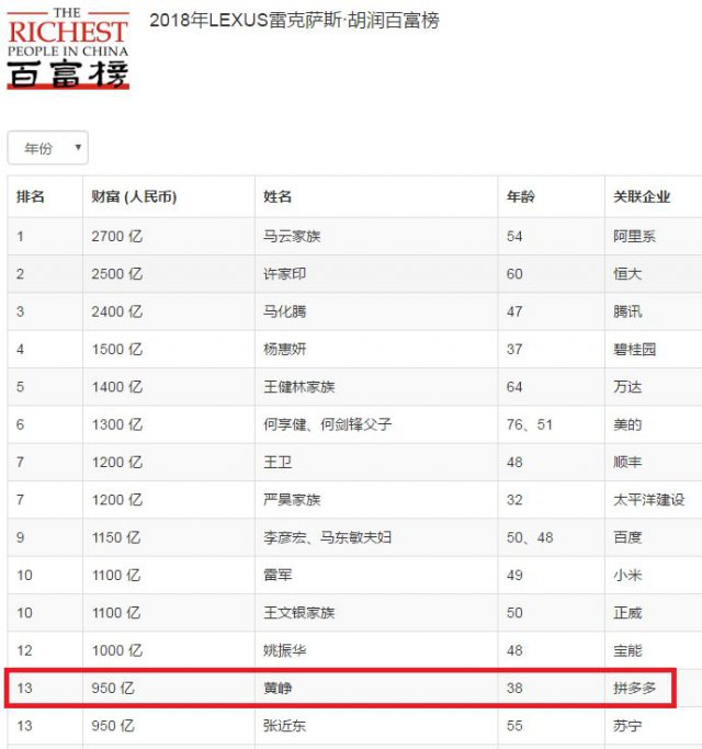 而在胡润研究院早些时候发布的《2018 胡润百富榜》中,黄峥位列第 13 名。在互联网领域仅次于马云、马化腾和李彦宏,排在网易丁磊、京东刘强东和今日头条张一鸣之前,与创业 28 年的苏宁张近东持平。