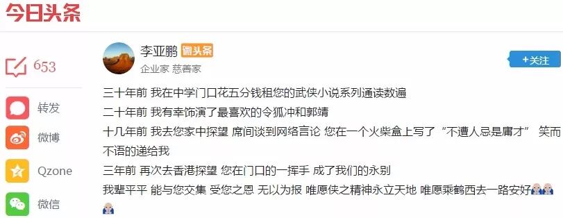 而金庸也是近代文学史上,作品为数不多能被雅俗共赏的作家之一。在微头条上,不管是马云、张一鸣等互联网创业人士,或是张纪中、李亚鹏、黄晓明、胡军、刘亦菲等与金庸有过合作的影视行业人士,还是温润安、王蒙、南派三叔等知名作家,甚至是宝莱坞的阿米尔汗,都在缅怀先生的逝世。
