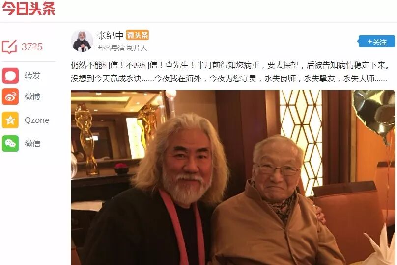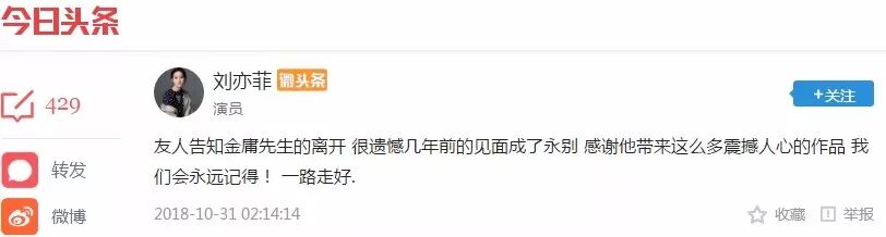 金庸小说的影视改编历史源远流长,“飞雪连天射白鹿,笑书神侠倚碧鸳”加之《越女剑》十五本小说捧红的角色不在少数,导演张纪中、演员胡军、刘亦菲、黄晓明、李亚鹏、赵雅芝、六小龄童等曾因影视剧与金庸结缘的明星,均在微头条发文悼念先生的离去。