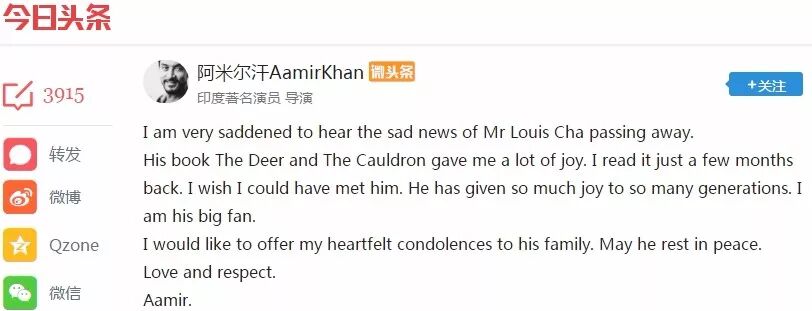 长久以来,坊间流传着“凡是有华人的地方,就一定有金庸的武侠小说”这种说法,但被金庸魅力所折服的何止华人。微头条上,宝莱坞天王、曾主演《三傻大闹宝莱坞》《我的个神啊》《摔跤吧!爸爸》等经典印度片的阿米尔汗也发文悼念金庸。“I wish i could have meet him.He has given so much joy to so many generations.I am his big fan.”未在金庸先生有生之年一睹真容,也成了阿尔米汗的遗憾。