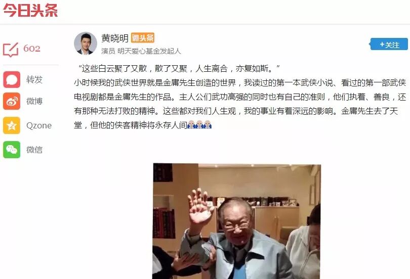 李亚鹏、胡军、黄晓明三人更是放出了三年前于香港拜会金庸先生的照片,未曾想临别时先生在门口的挥手竟成了永别。