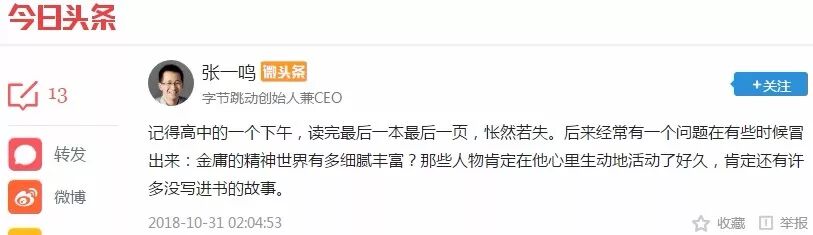 字节跳动创始人兼CEO张一鸣在微头条悼念金庸称:“记得高中一个下午,读完最后一本最后一页,怅然若失。后来经常有一个问题在有些时候冒出来:金庸的精神世界有多细腻丰富?那些人物肯定在他心里生动地活动了好久,肯定还有许多没写进书的故事。”