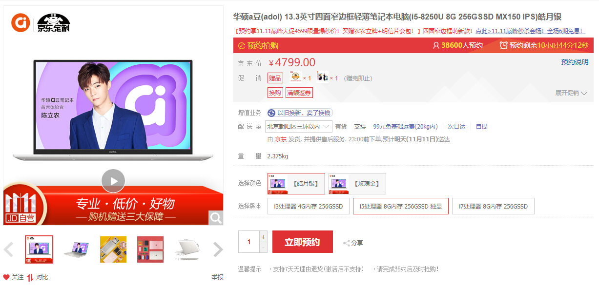 说走就走的外勤是职场人的日常必备,作为职场的得力助手,一款轻薄便携的笔记本就显得尤为重要,a豆笔记本13借时尚出位,以轻薄加冕,双十一当天参与华硕盛典,特价限量秒,i5皓月银款惊爆价4599元,更多好礼尽在华硕京东自营官方旗舰店。a豆笔记本13软萌出道,轻约1.25kg,薄约17.9mm,比同尺寸笔记本小一圈,轻松塞进C4信封袋,为外出“减负”,精巧携带,迷你出行。简约时尚的设计搭配玫瑰金、皓月银两种配色,天生爱出色,个性又多彩,是魅力出行的