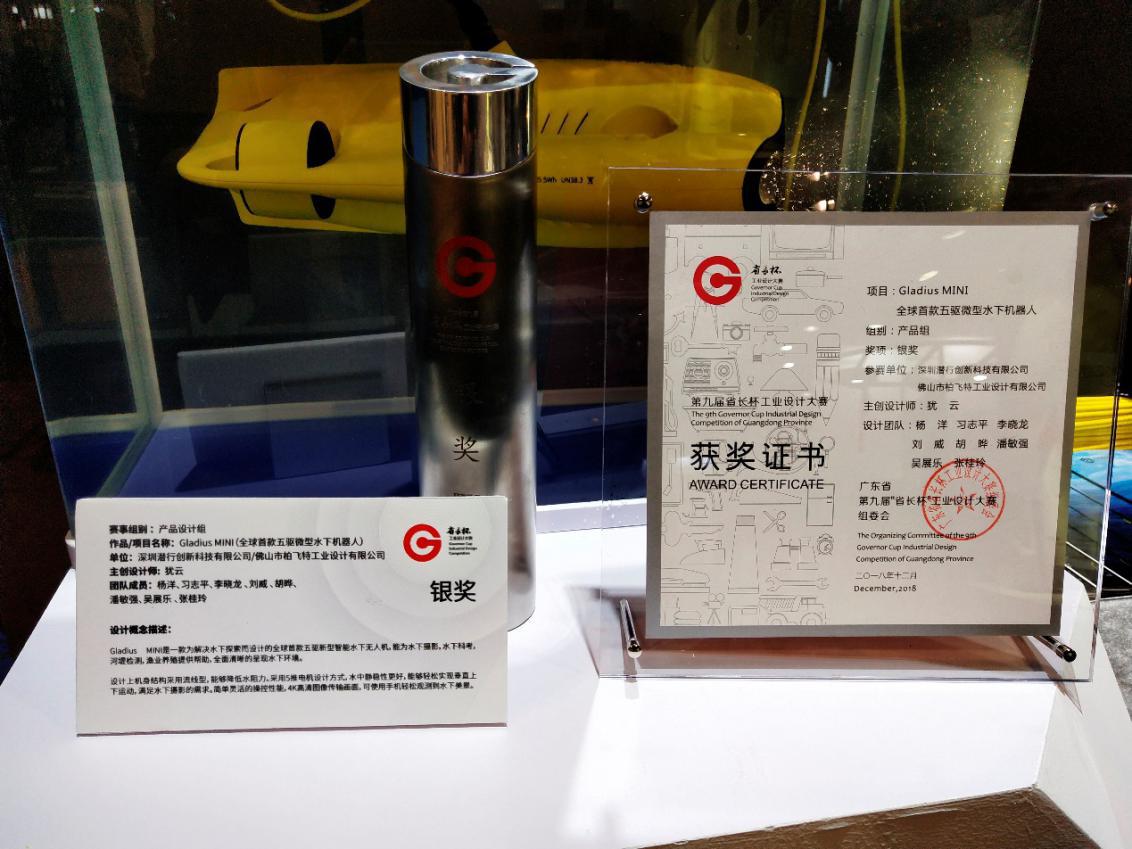 深圳潜行创新科技有限公司携最新研发的潜拍无人机“鲛GLADIUS MINI”参与产品设计组的角逐,历经初赛、专项赛(复赛)、决赛总评以及最终答辩,在总决赛513件作品中胜出,获得大赛银奖。