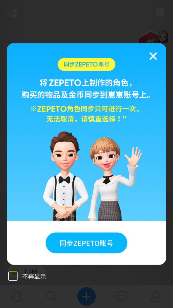 用户可选择同步ZEPETO账号。同步后,用户名、ZEPETO上制作的角色、购买的物品及金币将会转移到崽崽账号上。