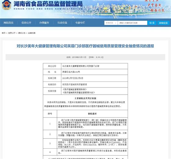 今年1月11日,湖南食品药品管理局就对长沙美年大健康管理有限公司芙蓉门诊部医疗器械使用质量管理安全抽查情况进行通报。据通报显示,长沙美年大健康管理有限公司芙蓉门诊部存在四个方面的缺陷问题。