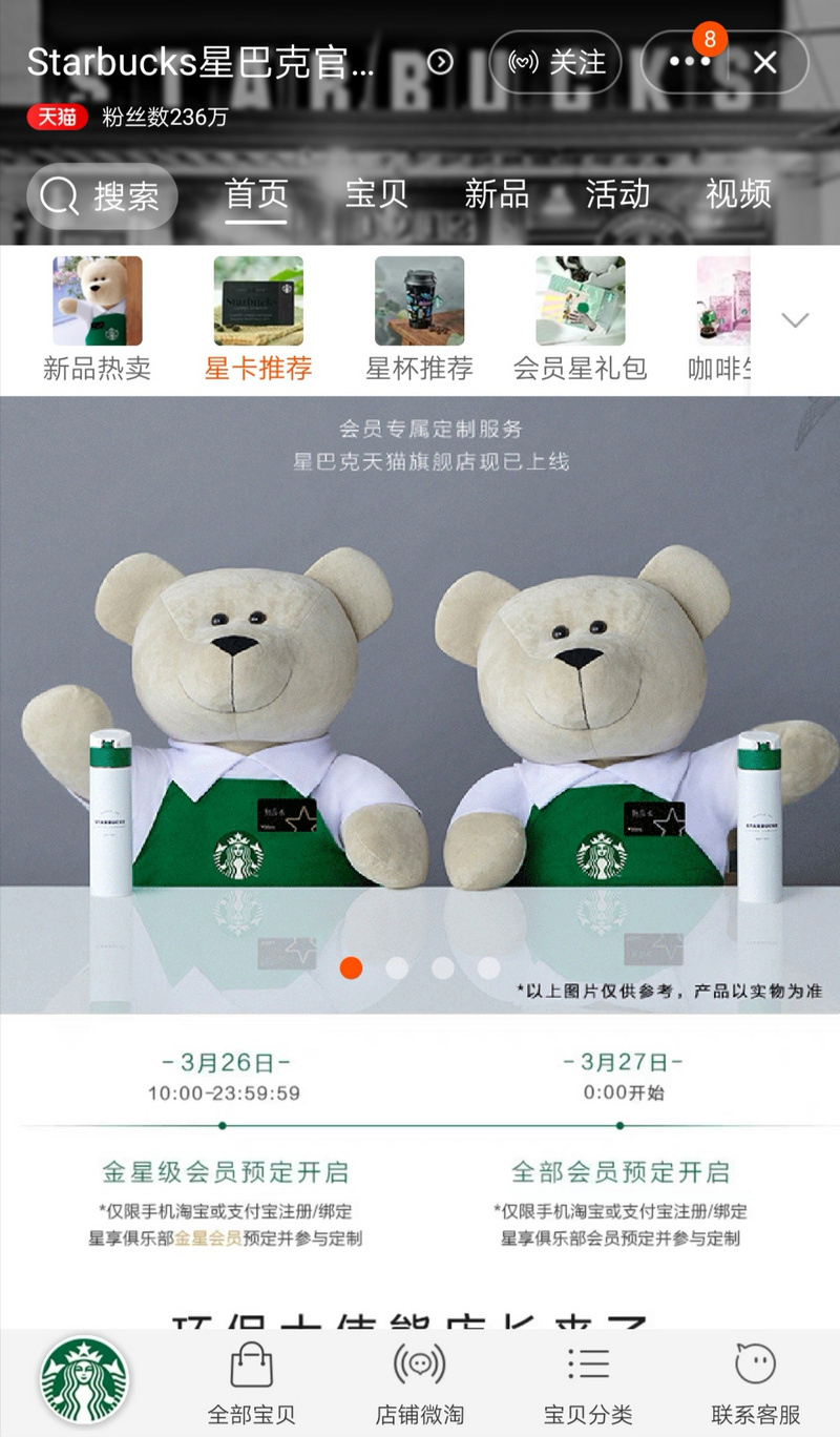 最近,星巴克天猫官方旗舰店上发布了一款 80cm 高的抱抱熊,预售价格为 699 元。与猫爪杯一样,这款周边的定位也是 " 会员专属定制服务 "。3 月 26 号,仅限金星级会员预定,27 日之后,才开放普通会员预定,6 月 30 日之前发货,且只能通过淘宝购买,一个淘宝 ID 只能预订一个,数量有限先定先得。虽然官网并没有公布其备货量,但截至发稿前,这款抱抱熊已经在星巴克官方旗舰店下架。