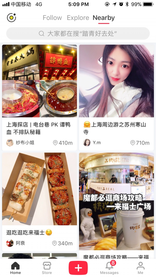 在这些专题页,收纳了多个附近店铺的POI详情页。门店的POI详情页中除了店铺介绍、地址等信息外,还集合了相关的笔记和图集,并设有“探店打卡”、“记录旅行”和“记录体验”等引导拍照和分享的功能按钮。