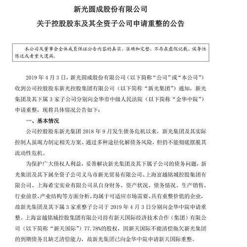 新光集团公告称,2018 年 9 月底发生债务危机以来,公司通过多种途径化解债务风险,但仍不能彻底摆脱公司的流动性危机。为解决债务问题,新光集团及其全资子公司新光贸易、上海富越、上海希宝分别在 3 月 20、21 日通过股东会决议,并在 4 月 3 日向金华中院申请重整。其中上海富越持有新天国际 77.78% 股权,新天国际由于不能清偿到期债务也被申请重整。