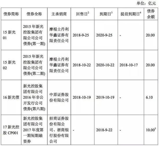 新光集团发行总额 20 亿元,票面利率 6.5% 的债券 "15 新光 01"(135319.SH)本预计于 2018 年 9 月 22 日进行回售。9 月 25 日,新光集团本应该支付回售金额 17.40 亿元,第三个付息年度利息 1.3 亿元,可是当天,公司并没能将债券回售资金划至指定银行账户。