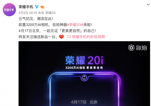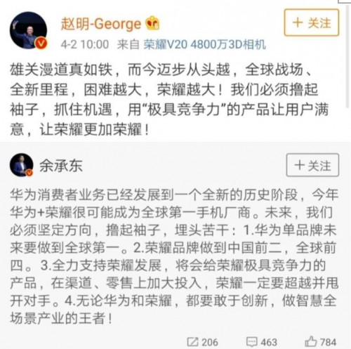 说到荣耀20,首先要回忆回忆几天前,余承东曾发微博表示,要撸起袖子埋头苦干,以先进技术和硬核品质领先行业,争取将荣耀做到极具竞争力,争取做到全球第四,全国第二。看来华为全力支持荣耀,要给荣耀极具竞争力的产品,而这个产品小编猜测估计就是荣耀20了!