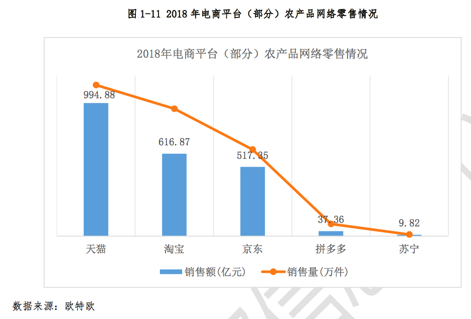 《报告》中总结:无论是从农产品的网络零售额还是销售量来看,天猫、淘宝平台依然是县域农产品线上销售的主渠道,且其他电商平台在短时间内难以赶超。