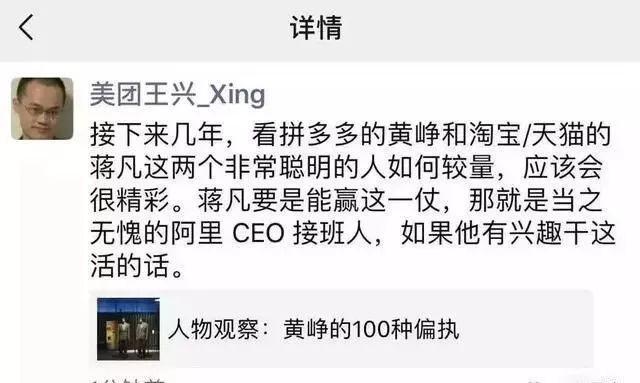 就连美团CEO王兴也曾在朋友圈中,这样发表过对拼多多黄峥和阿里蒋凡这两个聪明领袖的较量期待,并宣称:淘宝只要打赢拼多多,蒋凡就是当之无愧的阿里CEO接班人。