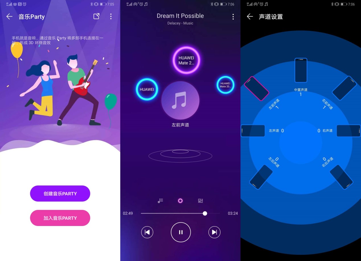面对着音乐体验踟蹰不前的行业状况,华为音乐的工程师们与各类型用户深入沟通,探索和发现着最本质的需求。“用手机听音乐,从用户体验方面来说,其实已经很多年没有大的创新了。要么用耳机,要么就是用手机自带的喇叭,偶尔有人来一把微创新,就是给手机装上两个喇叭,播放立体声。但是手机体积有限,这样的立体声跟单声道区别不大。后来我们突然想到,为什么不试试用多部手机一起来播放音乐呢?”于是,从这个简单的构想出发,华为音乐的工程师们却花费了不小的心思——从2部手机的双声道立体声到多部手机的5.1、7.1声道播放,如何让手机实现声道分配以及音量调节,如何在同一网络的环境下实现零延迟的同步播放,如何让用户可以实现快速创建Party群组,如何快速加入,如何满足聚会的火爆音效以及沙龙式的高品质回放需求……