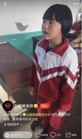 视频里,这个叫甜甜的姑娘多出现在背景破旧的乡村教室里,齐刘海、西瓜头,脸蛋上永远顶着两坨红晕。