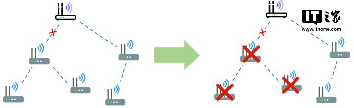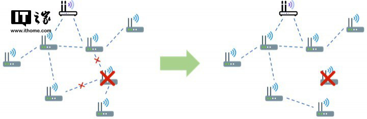 我们之前提到过,传统桥接网络中,某级路由器失效则其后所有的路由器全部失效,而 Mesh 网络中当某一路由器 / 节点因故失效时,与其连接的节点会自动且快速地切换到其他节点,以保证正常的网络连接。