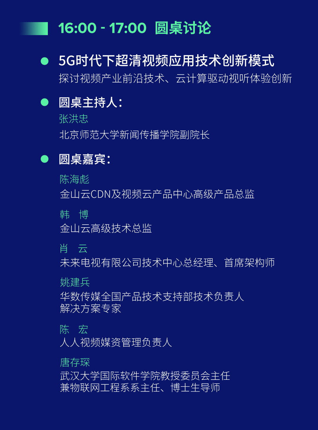 在主题为“5G时代下超清视频应用技术创新模式”论坛的圆桌讨论环节,各位演讲嘉宾将共同探讨视频产业前沿技术、云计算驱动视听体验创新,带给大家更多维度的思考和启迪。