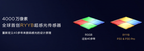 值得一提的是,为了提高手机相机的感光性能,华为P30 Pro并不满意于只有更大的传感器,采用了革新的像素排列设计,摒弃过去40年的RGGB像素排列,而更换为RYYB。这个全新的像素排列,能够让手机相机传感器的进光量提高40%。