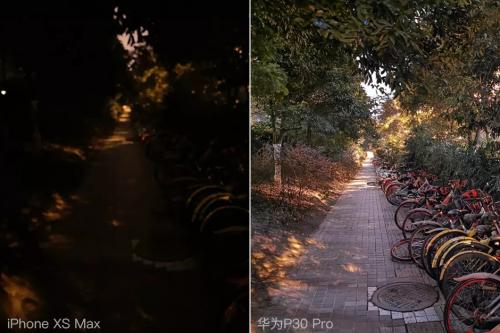 在同一环境下,iPhone XS Max拍出来的照片漆黑一遍,而华为P30 Pro则拍得像白天一样明亮纯净,不单只的画面明亮,而且色彩饱和也很高。这不是拍得好不好的差距,已经是能不能拍到的差距了。