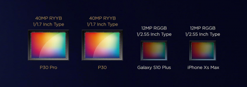 首先,在传感器设计上,这颗4000万像素的主摄像头依然维持超大底的设计,相机传感器面积远大于三星S10 Plus、iPhone XS Max等机型。