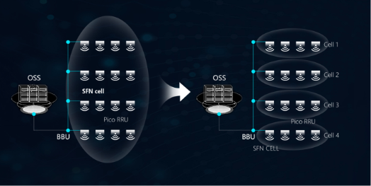 锐捷全新的5G室内架构,由于Flex-RAN⽩盒架构的采用,可通过将BBU下属的pRRU分组实现1~4个⼩区之间的灵活扩展和合并。比如,将下挂的64个pRRU每32个分为两组,每组为一个小区,支持小区分裂和小区合并,BBU支持2小区和4小区,接口一致,可无缝扩容,⾮常适合运营商或者企业分步进⾏5G投资。