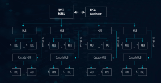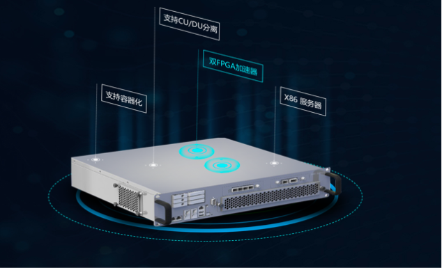 锐捷5G数字室分解决方案采用通用X86 +FPGA加速的架构,实现全软件5GNR协议栈,包括:L1/L2/L3,可灵活演进适应后期的uRLLC等切片以及定制化的协议栈功能