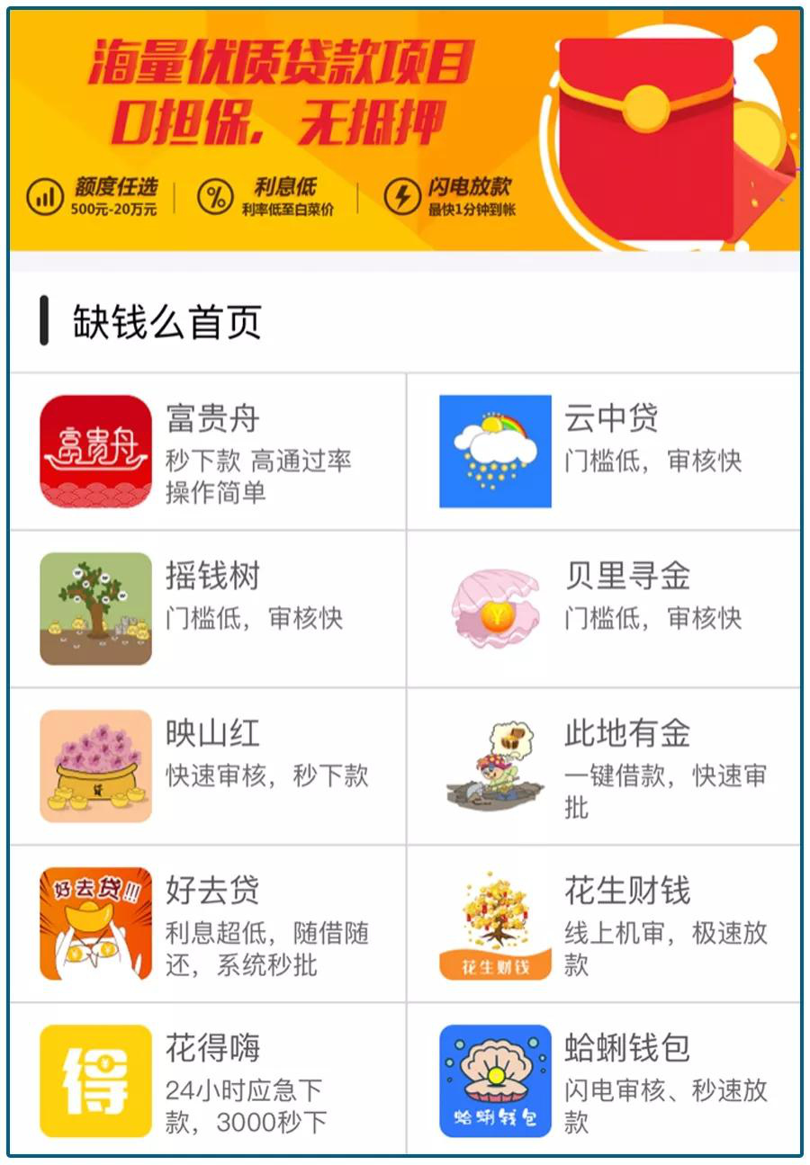 不过,今年三月,缺钱么还是贴出了一则严正声明,缺钱么已经根据法律法规停止了现金贷业务。但是,自己不放贷,不意味着真的退出了行业,现在已然可以在缺钱么官网上找到新的 " 撸口子 " 的入口,贷款超市,为花式的现金贷倒流。