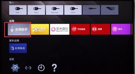 四、此时将要安装的电视软件如当贝市场的apk安装包拷贝到U盘。将U盘连接电视的USB接口,在电视主页选择应用下的“应用助手”打开。这时我们就可以看到U盘已经识别了,也可以显示当贝市场apk安装包。