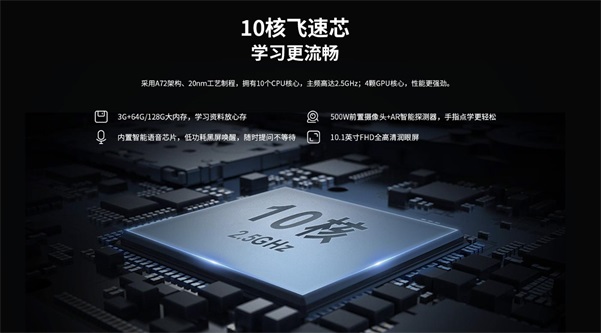 在市场上大部分学习机还是6核、8核的时候,优学派U36已经走在了行业前方,搭载10核处理器,性能强、运行速度快,让孩子学习更流畅。再加上3G +64G超大存储空间,可支持128G内存拓展,看视频、做习题、练听力多重任务切换自如,再多学习资料也存得下。10.1英寸大屏,1920*1200 FHD IPS超高清润眼屏,画质清晰细腻,显示效果更为逼真,而且支持多点触控,触击屏幕反应灵敏,实际使用体验非常好。