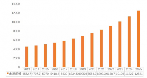 图1:2013年~2025年全球FPGA市场规模。(单位:百万美元。数据来源:MRFR)