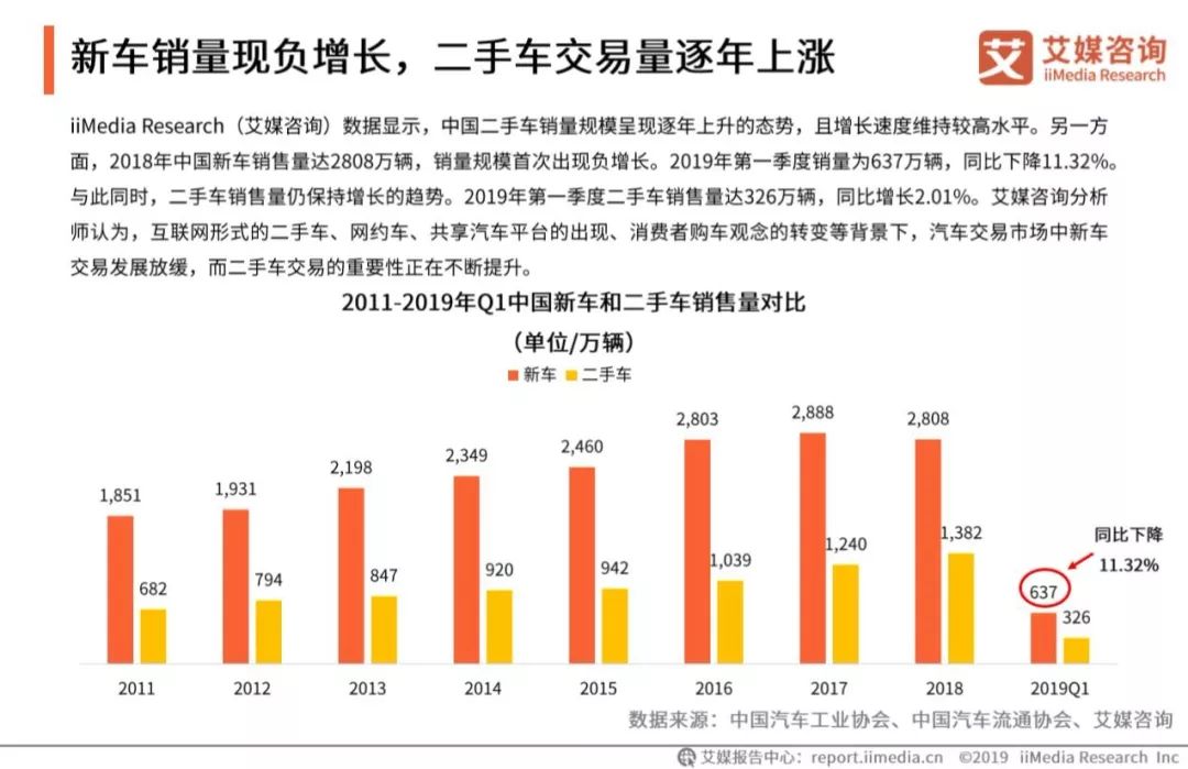 2018年新车的销售量与2017年相比下降了约2.76%,首次呈现负增长。2019年新车销量增长继续呈现颓势,第一季度销售量仅为637万辆,同比下降11.32%。与 此同时,二手车交易量增长了约11.46%。汽车交易市场中,二手车交易的重要性正在不断提升。