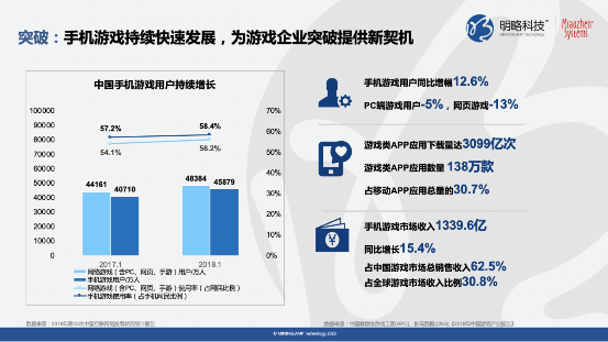 2018年期间,PC端游戏用户、网页游戏用户均呈现负增长,分别为-5% 和-13%。手机游戏一枝独秀,用户同比增幅为12.6%,游戏类APP应用下载量达3099亿次。此外,手机游戏市场收入达1339.6亿元,同比增长15.4%。