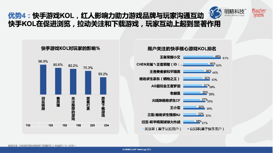 此外,快手游戏KOL的影响力强。众所周知,快手游戏KOL助力游戏品牌与玩家建立沟通、互动的关系,在拉动关注和下载游戏方面效果显著。报告显示,快手游戏KOL对玩家浏览视频的影响高达96%。