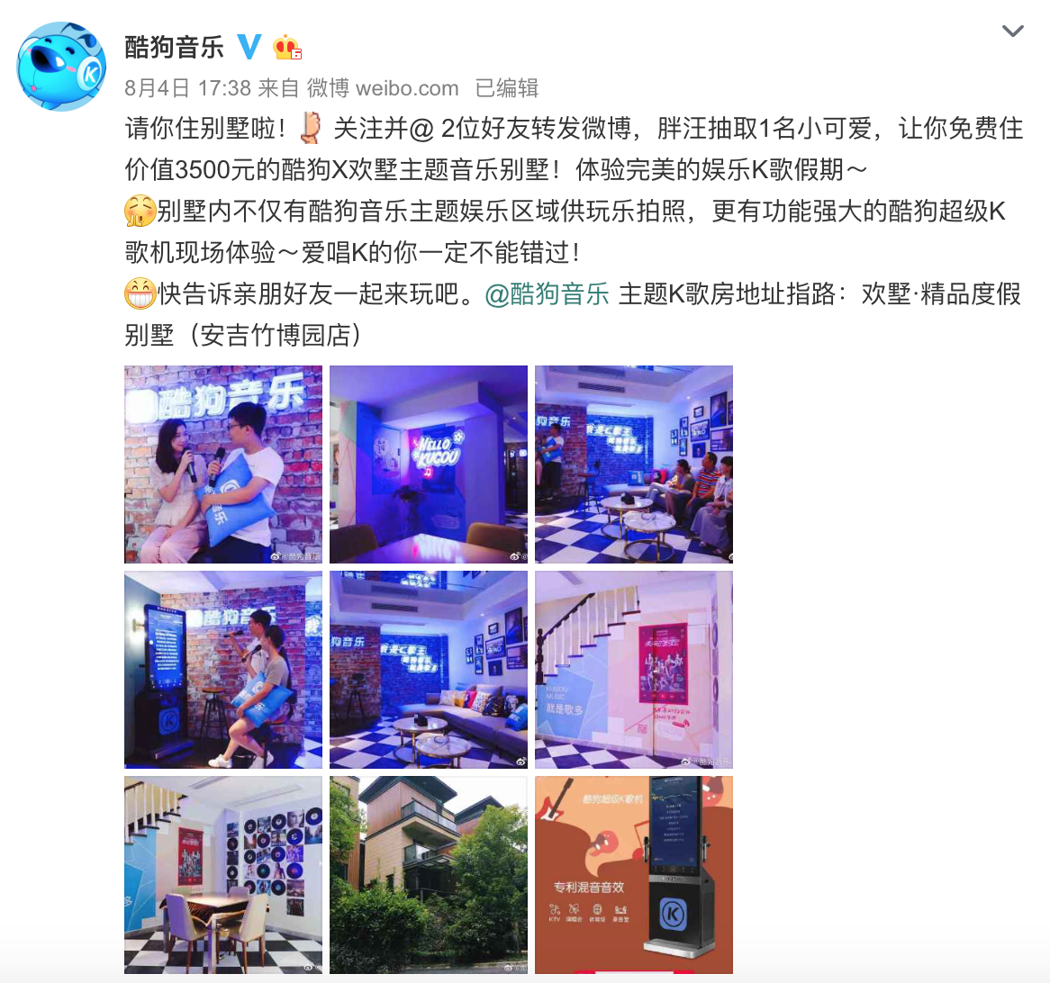 欢墅·酷狗音乐主题别墅在七夕之际亮相,除了线下场景打造,双方也在微博、抖音等新媒体渠道推出了联合品牌营销活动。进入酷狗音乐官方微博,并@2位好友转发微博,即有机会与朋友家人一起免费住价值3500元的欢墅·酷狗音乐主题别墅,在可以容纳8人的独栋大别墅里体验友人欢聚的美好时光。
