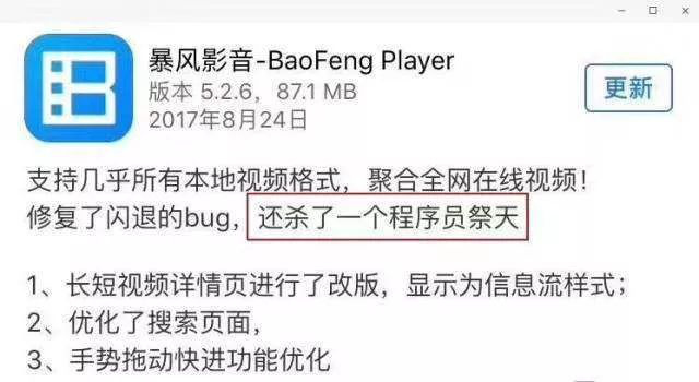 2017 年暴风影音在苹果应用商店上线时,在介绍页面写着:「修复了闪退的 bug,还杀了一个程序员祭天。」