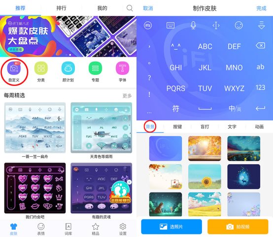 爱美是人的天性,每个人都喜欢美好的事物,当然也包括输入法,但从皮肤商店换肤的常规操作已经不能突显个性魅力。此次讯飞输入法自定义皮肤功能再次升级,在自定义按键、盲打键盘、字体、动画的基础上加入好看的背景图,丰富自定义皮肤的创作。